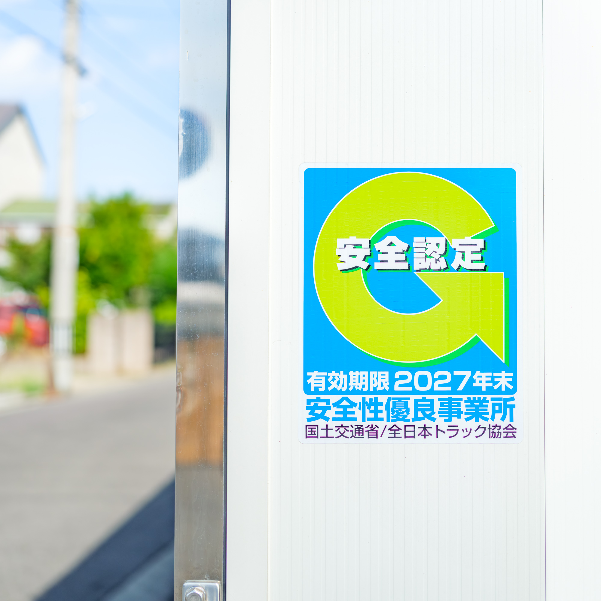 安全性優良事業所とは、お客様が安全性の高い運送会社を選びやすくすることを目的とし、全日本トラック協会による厳しい審査を通過した事業所のこと。Gマークは安心・安全・信頼を認められた証です。